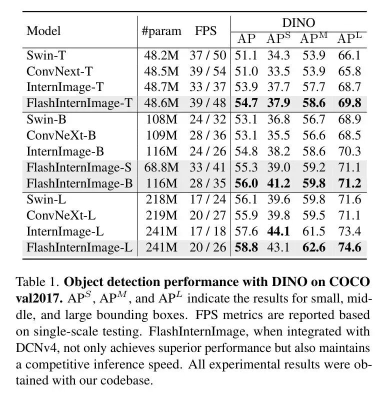 带有高级标题的下游结果:使用更先进的DINO和Mask2Former来进一步验证FlashInternImage的有效性,如Tab. 1和Tab. 3所示。