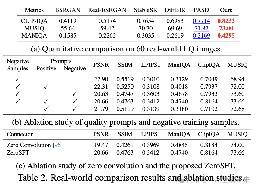 「负质量样本和提示」。前面表2b显示了在不同设置下的一些定量结果。在这里,使用描述图像质量的积极词语作为“正面提示”,并使用负面质量词语以及前面描述的CFG方法作为负面提示。可以看出,单独使用积极提示或负面提示可以提高图像的感知质量。同时使用它们可以产生最佳感知结果。如果在训练中没有包含负样本,这两个提示将无法提高感知质量。前面图4和图11(a)展示了使用负面提示带来的图像质量改善。