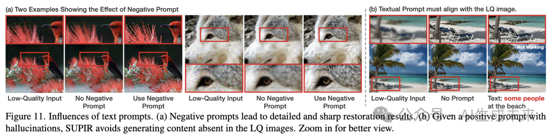 可以看出,负面提示在提高输出图像的整体质量方面非常有效。还观察到,在我们的方法中,提示并不总是有效的。当提供的提示与LQ图像不符合时,提示会变得无效,参见上面图11(b)。对于一个IR方法而言,保持对提供的LQ图像的忠实是合理的。这反映了与文本到图像生成模型的显著区别,并强调了我们方法的鲁棒性。