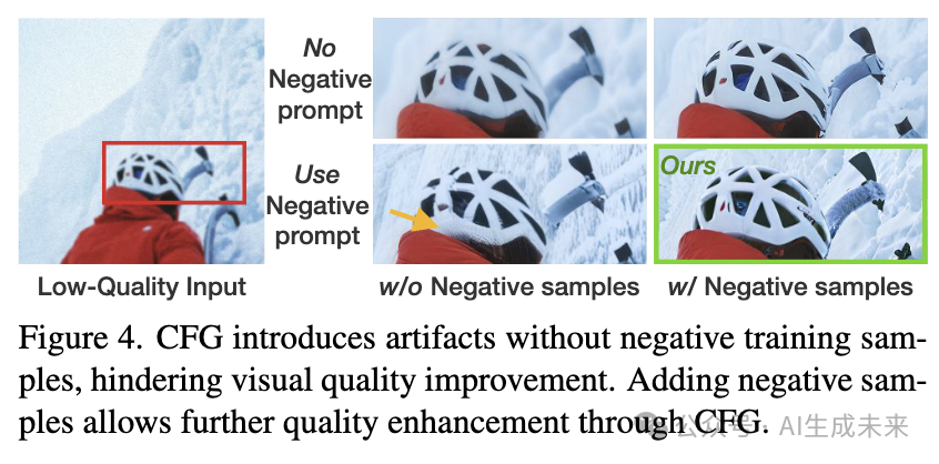 在这里,H(·)表示带有适配器的扩散模型, 是时间步骤t的噪声方差, 是一个超参数。在我们的框架中,pos可以是具有图像质量积极词汇的图像描述,而neg是具有负面词汇的图像描述,例如“油画,卡通,模糊,脏,凌乱,低质量,变形,低分辨率,过度平滑”。对于CFG技术,准确预测正和负对于其很关键。然而,在我们的训练数据中缺少负面质量的样本和提示可能导致SUPIR在理解负面提示方面失败。因此,在采样过程中使用负面质量的提示可能会引入伪影,参见下图4的示例。为解决这个问题,使用SDXL生成了与负面质量提示相对应的10万张图像。以反直觉的方式将这些低质量图像添加到训练数据中,以确保SUPIR模型能够学习负面质量的概念。