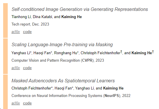 检索何恺明近两年发表的论文可以看到,多为表示学习、自监督学习、自编码器等方向。