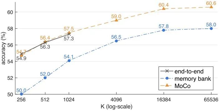 通过对end-to-end、memory bank和MoCo三种方法的对比实验可以看出MoCo算法有着巨大优势。memory bank由于momentum update的是数据,可能训练过程会更加不稳定,导致精度远低于end-to-end和MoCo;end-to-end由于GPU容量大小的限制,导致不能使用更大的batch size;MoCo通过dictionary as a queue和momentum encoder和shuffle BN三个巧妙设计,使得能够不断增加K的数量,将Self-Supervised的威力发挥的淋漓尽致。
