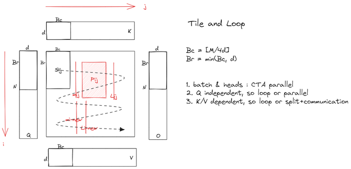 Google Research的工作每个block会产出一份中间结果,所有block执行完毕之后,再将他们的中间结果计算获得一个最终结果;FlashAttention则采用类似滑动窗口的方式,第i个block会将累积的中间结果传递给第 i+1 个block,也就是说最后一个block计算完毕后,可以保证整行的Softmax逻辑计算正确性。锐评:我认为这个点并没有什么独创性,Google Research这么考虑的原因也大概率是因为TPU的计算逻辑粒度适合沿sequence length切并行,切的越小越有利于TPU并行,最后再有一个逻辑来处理中间数据很正常。 -