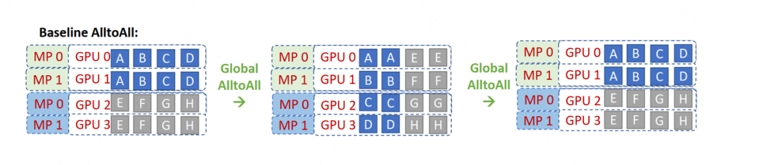 首先,non-moe层的输出结果尺寸为 (seq_len, batch_size, M),我们将其reshape为(S, M),其中S = seq_len * batch_size。同一个tp组内的输出因为经过了AllReduce所以完全一致。以g0这块卡上的数据来说,我们假设a0是要送往e0的tokens,a2是要送往e1的tokens,其余gpu上也是类推,这样我们就得到了图例中的第一行。 -