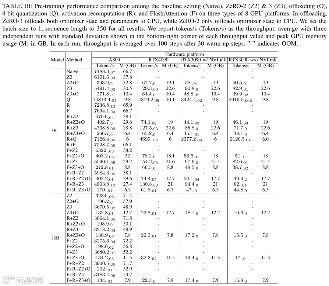 对于具有卸载功能的 ZeRO-2 和 ZeRO-3,他们分别将优化器状态和优化器状态 + 模型卸载到 CPU RAM。对于量化,他们使用了具有双重量化的 4bits 配置。此外报告了 NVLink 失效时 RTX3090 的性能(即所有数据通过 PCIe 总线传输)。结果如下表 III 所示。