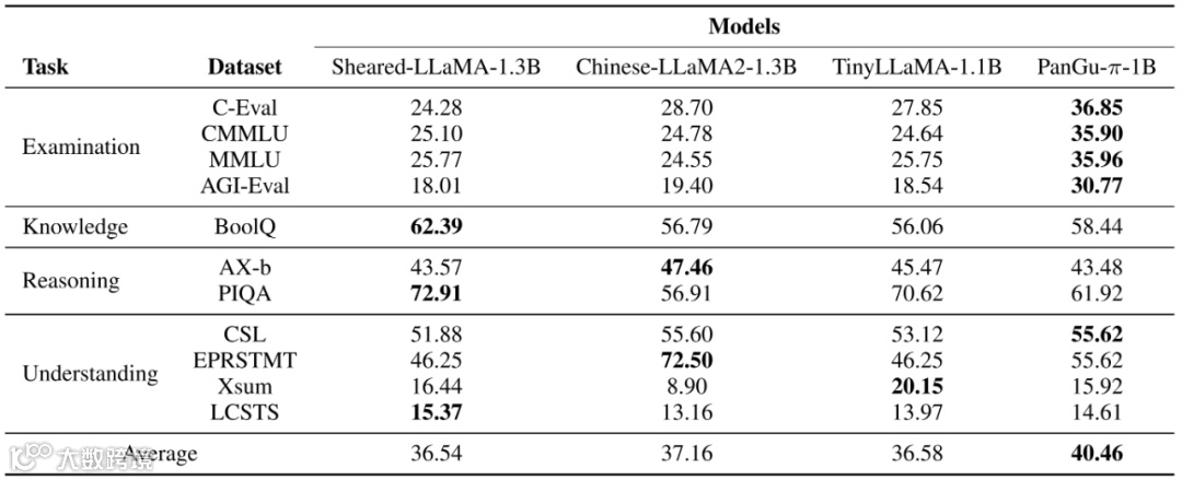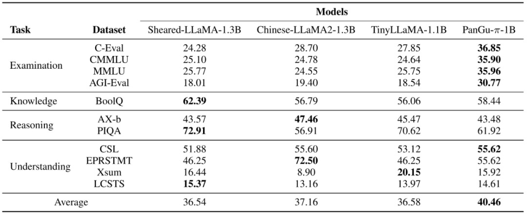 为了充分展示盘古 π 架构的能力,研究团队构建了 7B 和 1B 两个量级的模型,并将模型和现有的 SOTA 模型进行对比。