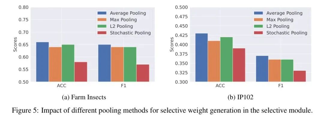 对于农场昆虫数据集,平均池化获得了最佳的准确率和F1分数,这表明它在保留分类任务的特征表示方面是有效的。此外,IP102数据集上的结果显示出一致的趋势。平均池化在农场昆虫数据集上的表现同样出色。
