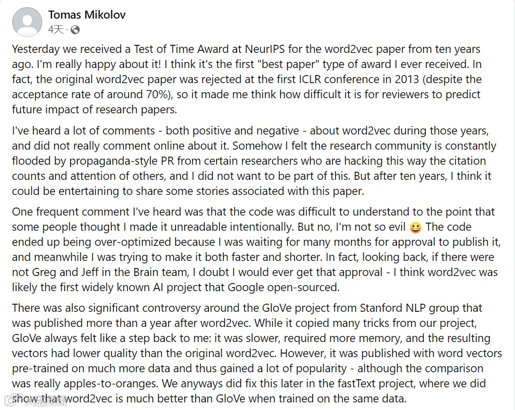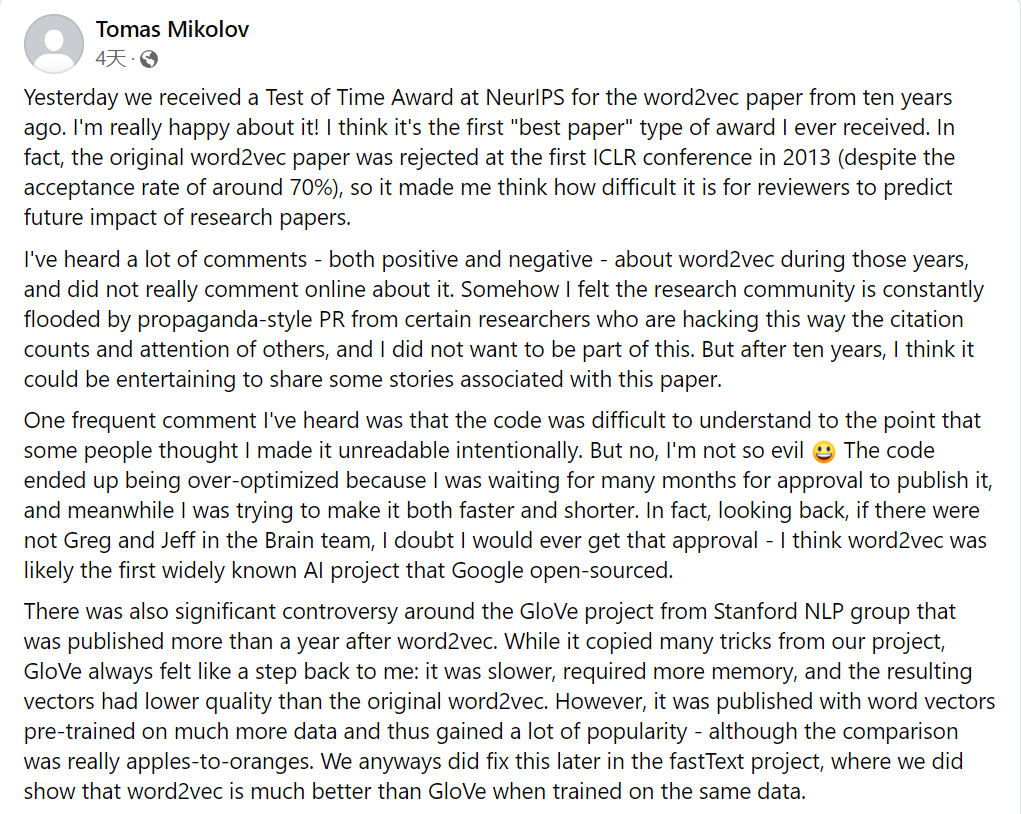 「我很高兴 Tomas Mikolov 和他的合著者赢得了时间检验奖。这是当之无愧的,几天前我已经在 Facebook 上向他表示祝贺了。