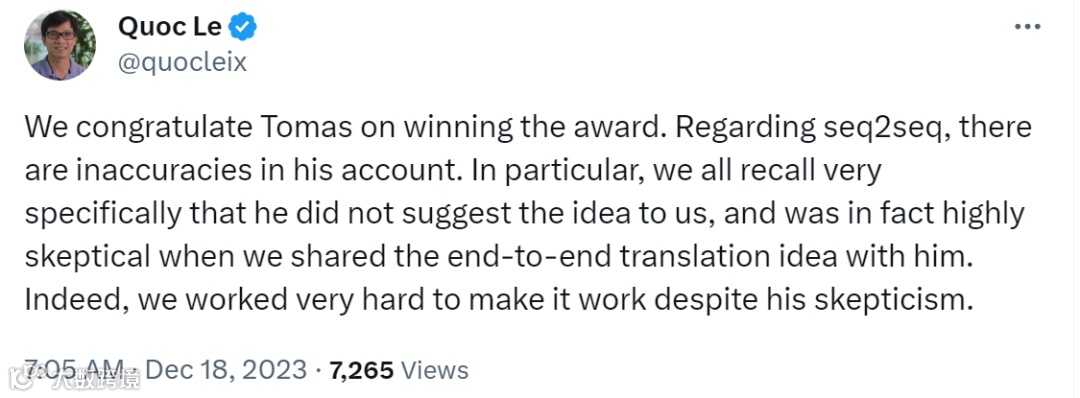 然而,作为 seq2seq 作者的 Quoc Le 并不认同 Tomas 的说法,Quoc Le 先是对 Tomas 参与的 word2vec 论文获奖表示祝贺。然后话锋一转,「关于 seq2seq,Tomas 的说法有不准确的地方。特别是,我们都记得非常清楚,他没有向我们提出这个想法,而且当我们与他分享端到端的翻译想法时,他实际上非常怀疑。事实上,尽管他持怀疑态度,我们还是非常努力地让这个想法发挥作用。」