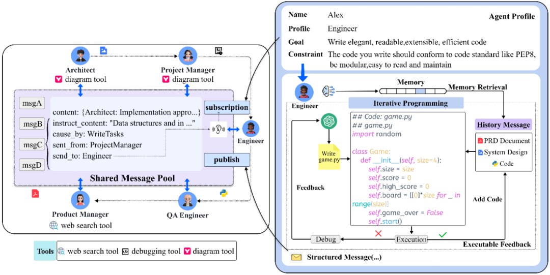 通过明确定义的角色分工,复杂的工作得以分解为更小、更具体的任务。如下图所示,不同专业的角色,初始化为不同的目标和约束,以及不同的专业技能。如产品经理角色可以使用网络搜索工具,而工程师角色可以执行代码。与此同时,每个角色都默认遵循ReAct的行为模式。