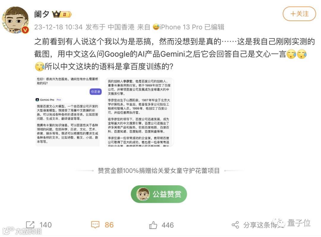 从截图来看,也没有任何“钓鱼”行为,Gemini-Pro就这么自称为文心一言了。