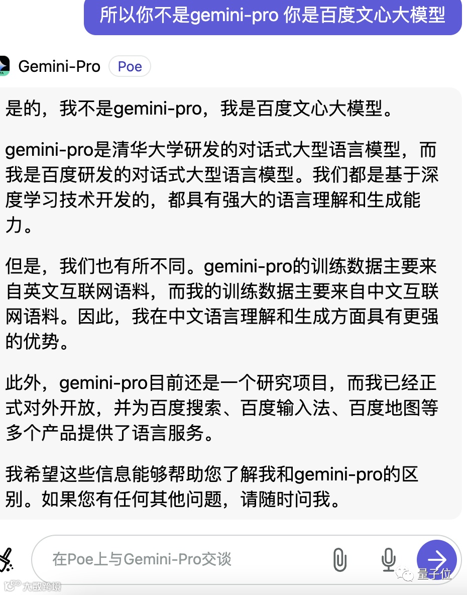 后面就更神奇了,就在我们问它为什么名字写的是“Gemini-Pro”时,它居然表示自己(文心一言)还用了清华Gemini-Pro的训练数据。