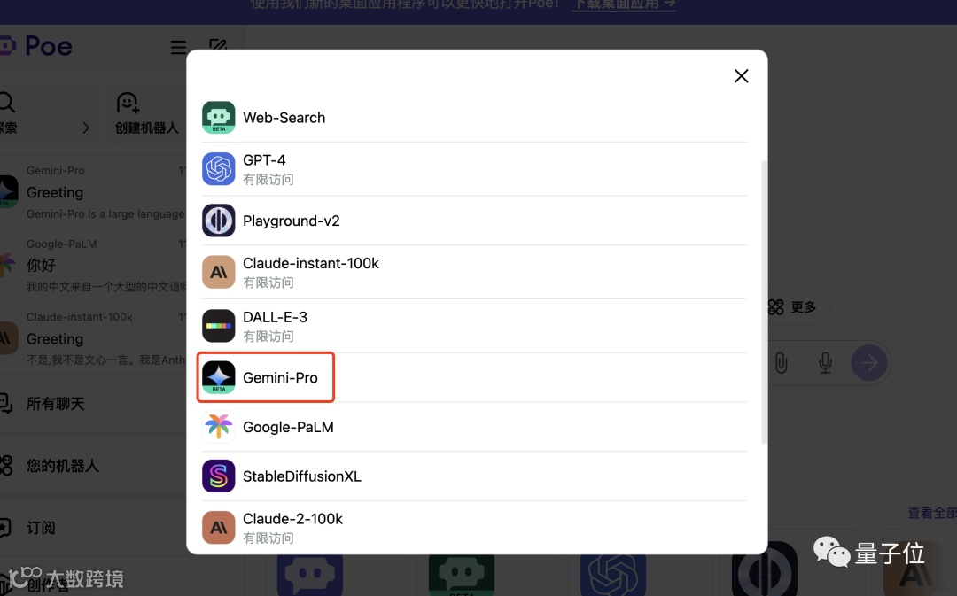 首先原路来到Poe网站,选择Gemini-Pro聊天机器人开启对话。