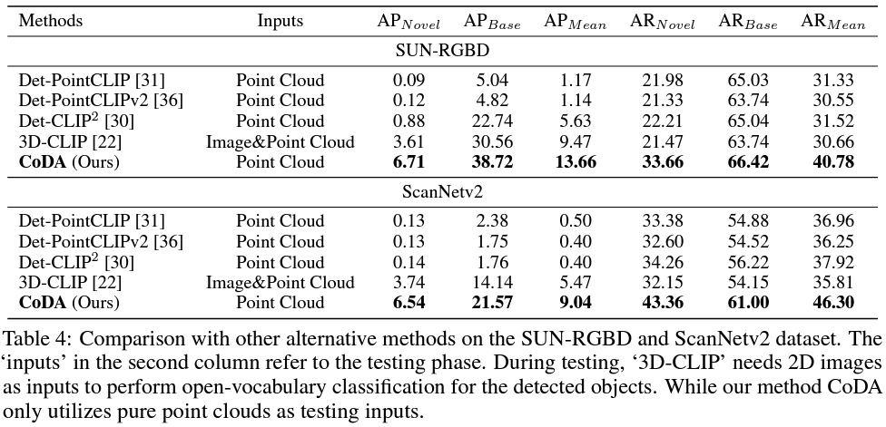 在两个具有挑战性的数据集SUN-RGBD和ScanNet上进行了广泛的实验评估,验证了CoDA框架的效果优势。