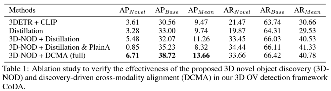 围绕着CoDA的两个核心创新点3D-NOD和DCMA,该论文做了一系列消融实验,如Tab. 1所示,相对于3DETR+CLIP的朴素的开放词汇检测方法,CoDA取得了显著的提升。当去掉3D-NOD时,效果显著下降,证明了3D-NOD本身带来了显著提升。当把DCMA替换成朴素的跨模态对齐时,3D-NOD+DCMA的效果有显著优势,证明了DCMA相对于其他对齐的优越性。