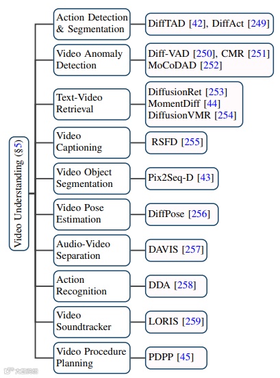 扩散模型在视频领域的应用已远不止传统的视频生成和编辑任务,它在视频理解任务上也展现了出巨大的潜能。通过对前沿论文的追踪,作者归纳了视频时序分割、视频异常检测、视频物体分割、文本视频检索、动作识别等 10 个现有的应用场景。