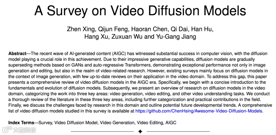 近期,复旦大学视觉与学习实验室联合微软、华为等学术机构发布了首个关于扩散模型在视频任务工作的综述,系统梳理了扩散模型在视频生成、视频编辑以及视频理解等方向的学术前沿成果。