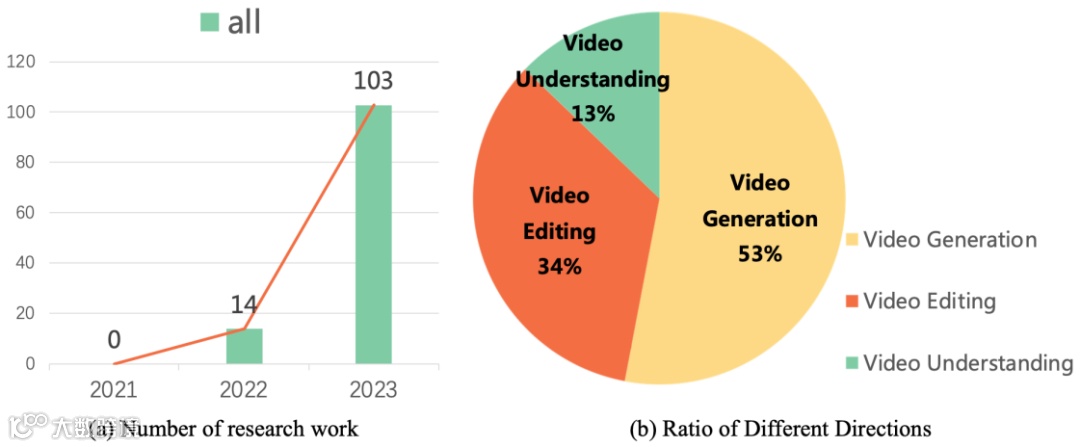 这些研究工作引领着视频生成和编辑技术的发展方向。研究数据显示,自从 2022 年以来,关于扩散模型在视频任务上的研究工作呈现出爆炸式增长的态势。这种趋势不仅体现了视频扩散模型在学术界和工业界的受欢迎程度,同时也凸显了该领域的研究者们对于视频生成技术不断突破和创新的迫切需求。