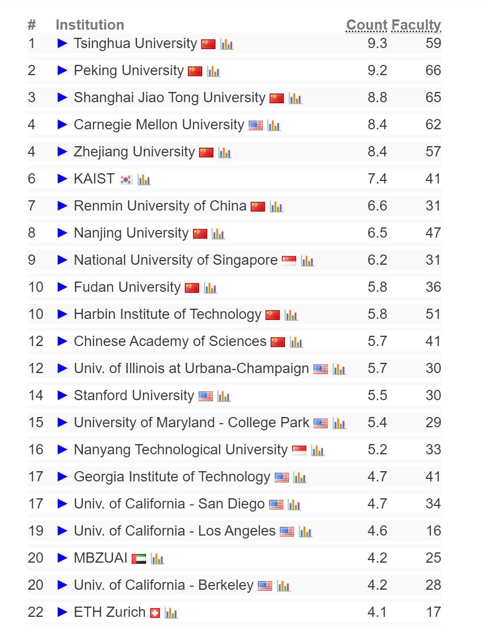 卡耐基梅隆大学第1,清华大学第2,上海交通大学第3,北京大学和伊利诺伊大学厄巴纳-香槟分校并列第4,浙江大学第6,苏黎世联邦理工学院和佐治亚理工学院并列第7,韩国科学技术院、斯坦福大学、加州大学圣地亚哥分校、密歇根大学、华盛顿大学并列第9,MIT、新加坡国立大学、UC伯克利、 马里兰大学帕克分校并列第14。