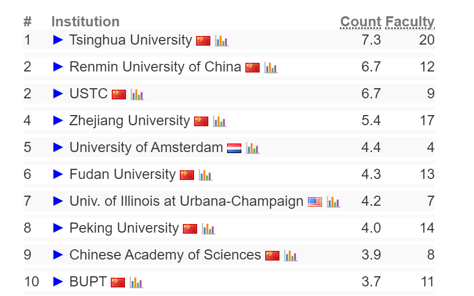 在AI大类中选择「网页信息检索」方向,全球前十的高校分别是清华大学、中国人民大学、中国科学技术大学、浙江大学、阿姆斯特丹大学、复旦大学、伊利诺伊大学厄巴纳-香槟分校、北京大学、中国科学院大学、北京邮电大学。
