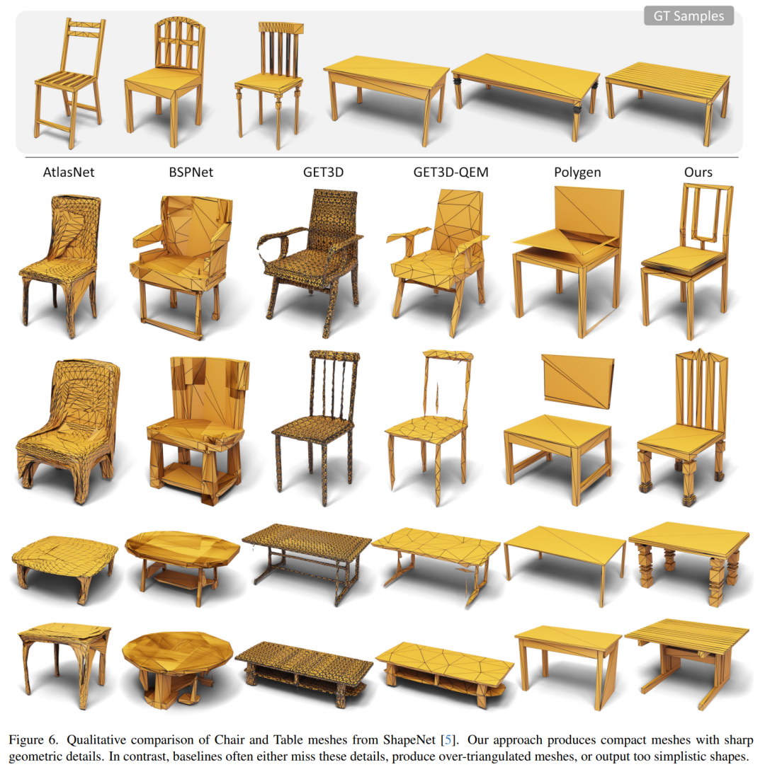 如图 6、图 7 和表 1 所示,在全部的 4 个类别中,MeshGPT 都优于基线方法。MeshGPT 可以生成尖锐、紧凑的网格,并具有较精细的几何细节。