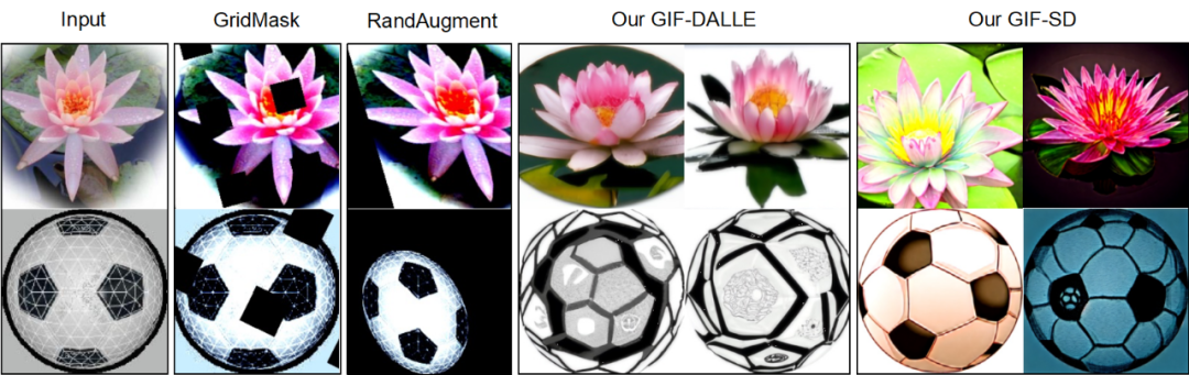 可视化结果 现有的数据增强方法无法生成新的图像内容,而 GIF 可以较好地生成带有新内容的样本。