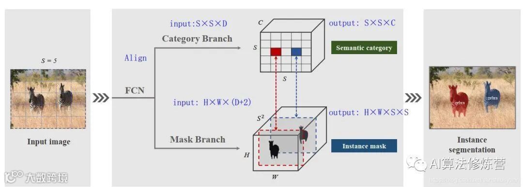 SOLO将图片划分成S×S的网格,如果物体的中心(质心)落在了某个网格中,那么该网格就有了两个任务:(1)负责预测该物体语义类别(2)负责预测该物体的instance mask。这就对应了网络的两个分支Category Branch和Mask Branch。同时,SOLO在骨干网络后面使用了FPN,用来应对尺寸。FPN的每一层后都接上述两个并行的分支,进行类别和位置的预测,每个分支的网格数目也相应不同,小的实例对应更多的的网格。