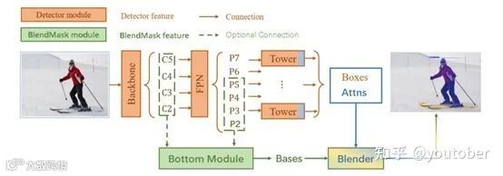 detector module直接用的FCOS,BlendMask模块则由三部分组成:bottom module用来对底层特征进行处理,生成的score map称为Base;top layer串接在检测器的box head上,生成Base对应的top level attention;最后是blender来对Base和attention进行融合。