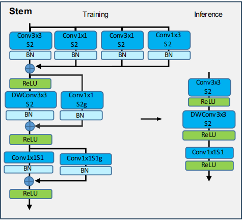 根据FastViT的建议,该模型的初始阶段采用具有两次降采样操作来减少计算负荷。通过使用Conv3x3+DWConv3x3设计实现了轻量化结构。初始卷积利用Conv3x1和Conv1x3重新参数化垂直和水平边缘提取。