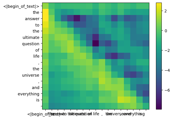 def display_qk_heatmap (qk_per_token):_, ax = plt.subplots ()im = ax.imshow (qk_per_token.to (float).detach (), cmap='viridis')ax.set_xticks (range (len (prompt_split_as_tokens)))ax.set_yticks (range (len (prompt_split_as_tokens)))ax.set_xticklabels (prompt_split_as_tokens)ax.set_yticklabels (prompt_split_as_tokens)ax.figure.colorbar (im, ax=ax)display_qk_heatmap (qk_per_token)