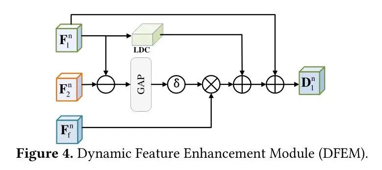 动态特征增强模块(例如DFEM ,如图4所示),旨在通过动态特征增强机制自适应地改进纹 作为输入,在模块中执行粗粒度融合特征 。通过从不同模态特征中相减来获得差异特征,增强这些差异特征的映射。随后,将这些差异特征与原始特征合并,用额外的模态补充信息丰富差异特征。这个过程有效地提取并放大图像中固有的互补特征和纹理细节,从而提高整体融合性能。