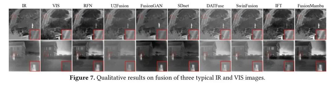 作者与最先进的方法进行了广泛的对比实验,以证明FusionMamba的有效性。这些对比方法包括CSMCA(Wang等,2019)、U2Fusion(Chen等,2019)、FusionGAN(Chen等,2019)、SDNet(Chen等,2019)、MATR(Chen等,2019)、IFT(Chen等,2019)和SwinFusion(Chen等,2019)。CSMCA(Wang等,2019)是传统的融合方法。SDNet(Chen等,2019)、FusionGAN和U2Fusion(Chen等,2019)是基于CNN的融合方法。MATR(Chen等,2019)、IFT和SwinFusion(Chen等,2019)是基于Transformer的结构。作者使用了相应的参数设置的公开代码。