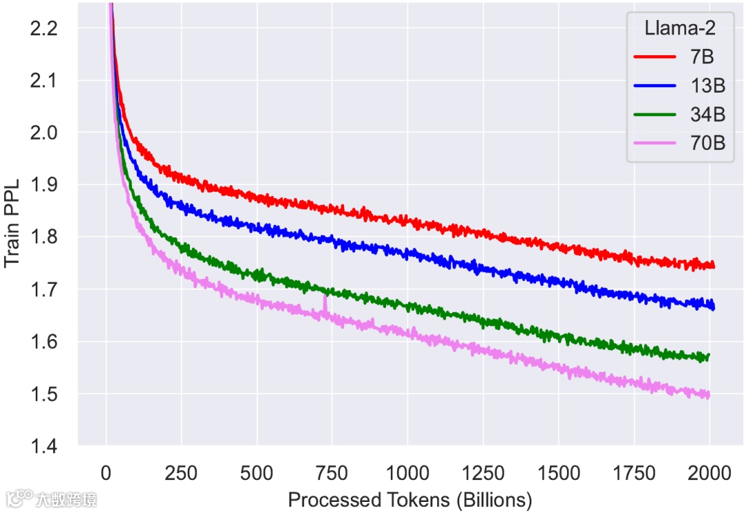 事实上,原因可能是这样的:在同一位置, Llama 2 7B 模型的质量低于 Llama 1 7B 模型,可能是因为其余弦调度被拉长了!