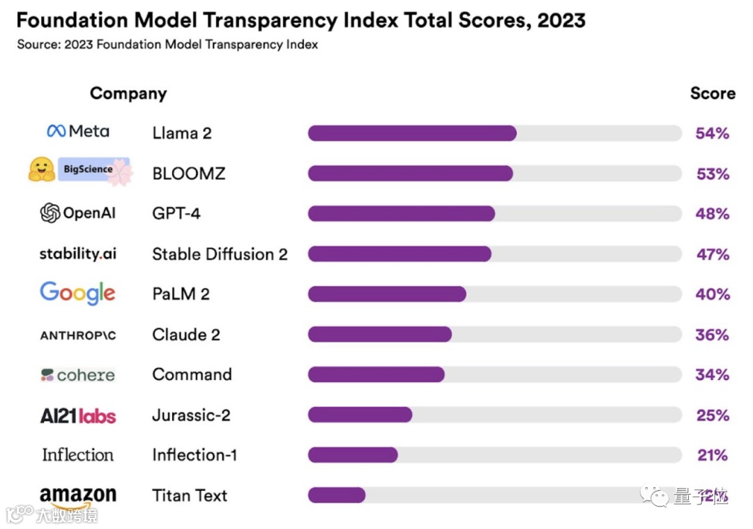 大模型透明度越来越低,透明度最高的是Llama 2,但得分也仅有54;