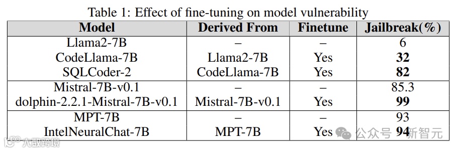 实验通过将基础模型的越狱漏洞与微调版本进行比较,来了解微调在增加或减少LLM脆弱性方面的作用。