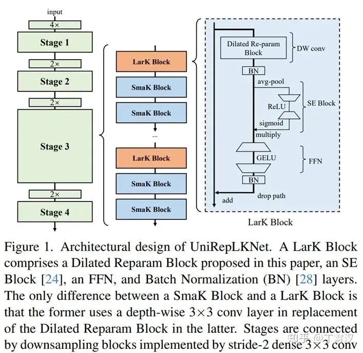 2022年我在RepLKNet [1]里提出了用超大卷积核(从13x13到31x31)来构建现代CNN以及正确使用超大卷积核的几个设计原则。但从架构层面看,RepLKNet只是简单地用了Swin Transformer的整体架构,并没有做什么改动。SLaK将kernel size进一步增大到了51x51,但其简单采用了ConvNeXt的架构。总得来讲,当前大核CNN架构设计要么遵循现有的CNN设计原则,要么遵循现有的Transformer设计原则。