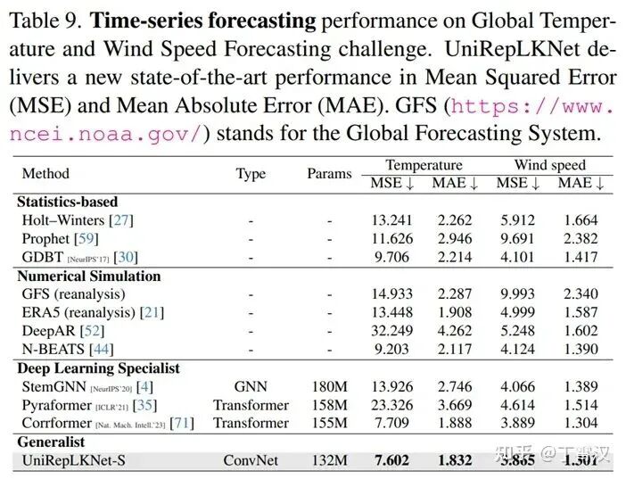 为了验证UniRepLKNet处理时序数据的能力,我们挑战了一个数据规模超大的《Nature》级别的任务:全球气温和风速预测。尽管UniRepLKNet本来是为面向图像任务设计的,它却能超过为这个任务而设计的CorrFormer [3](前SOTA)。