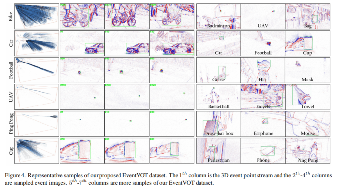 此外,由于现有的基于事件的跟踪数据集都是低分辨率的(346×260),本文提出了第一个大规模的高分辨率的(1280×720)数据集,命名为EventVOT。它包含了1141个视频,并涵盖了广泛的类别,如行人、车辆、无人机、乒乓球等。