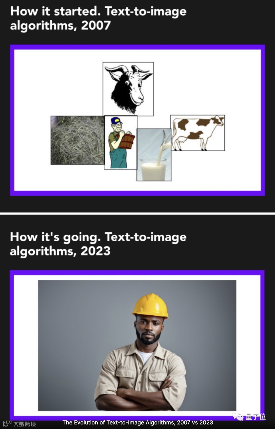 图片生成领域也已今时不同往日,下面是2007年文本-图像生成和2023年的效果对比:
