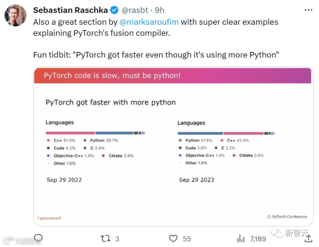 不过,在Pytorch发布会上,Sabastian还发现了一个小花絮,在新版本的Pytorch2.1其Python占比高达47.8%,比去年版本高了9.1%。