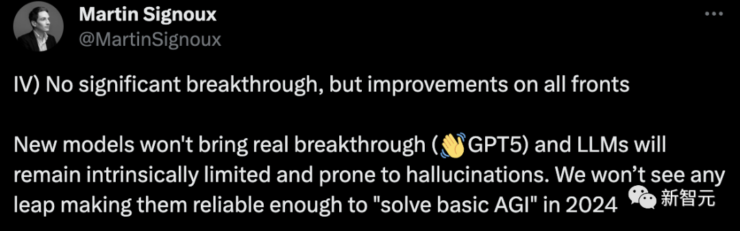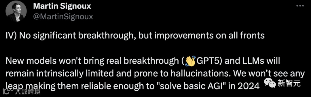 没有重大突破,但各方面都有改进。新模型不会带来真正的突破(GPT-5),LLM在本质上仍然有限,而且容易产生幻觉。我们不会看到任何飞跃,使它们在2024年可靠到足以「解决基本的AGI」。