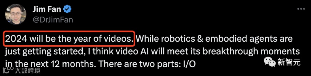 英伟达高级科学家Jim Fan称,2024年将是视频年。尽管机器人和具身智能体才刚刚起步,但我认为视频AI将在未来12个月内迎来突破性进展的时刻。