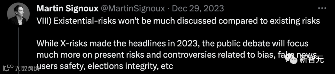 与现有风险相比,存在的风险不会引起太多讨论。虽然X风险成为2023年的头条新闻,但公众讨论将更多地关注与偏见、假新闻、用户安全、选举诚信等相关的现有风险和争议。