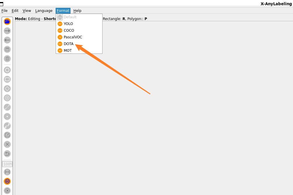 在顶部菜单栏中点击 Format选项,选择DOTA,并导入上一步准备好的标签文件。