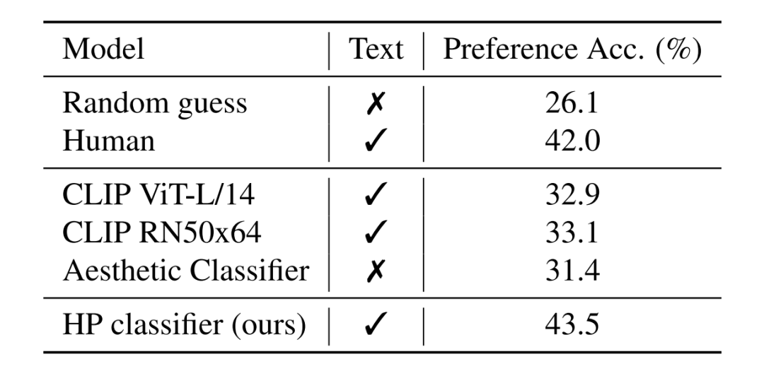 实验证明,相比一系列baseline,微调过后的CLIP (HPS)能够更好地预测人的偏好。