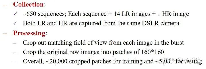 在很多其他工作中,也讨论了这种合成数据的泛化问题(比如做单帧real-world sr的LP-KPN[1]和CDC[2])。但是,即使在这种情况下,基于完全真实的数据进行超分的工作也非常少(这里暂时先不谈用随机noise/blur kernel建模degradation的工作),一个很大的原因就是真实数据太难获取和处理了。无论是配对场景的拍摄,再到图像后期的处理、矫正、对齐,再到最后的成像,每一步都是深渊巨坑(而且超分数据面临着比常规同分辨率配对数据更加难解决的问题,比如畸变等,可以参考zoom to learn[3]等文章)。
