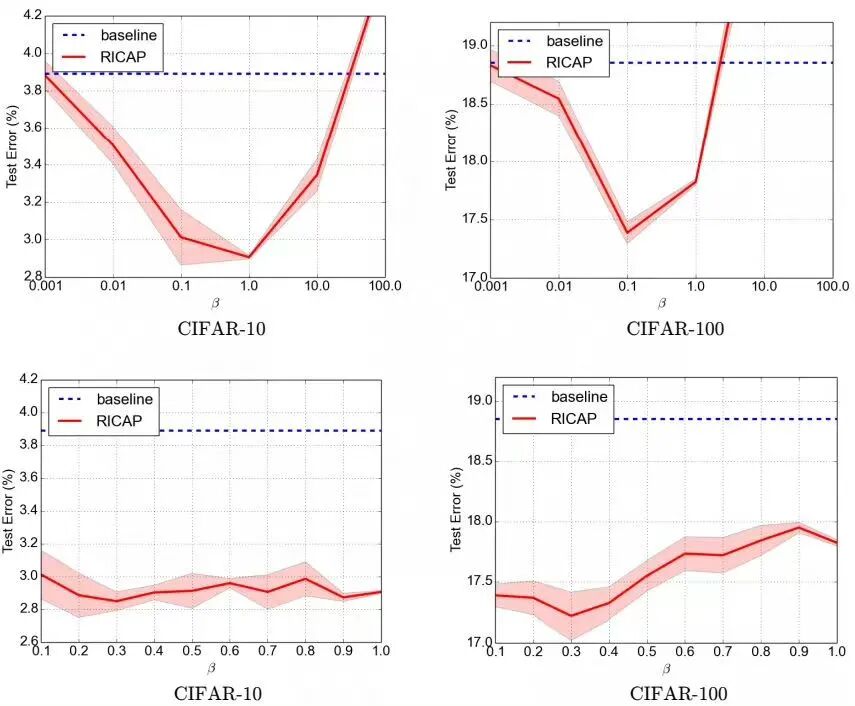 如下图所示,Ix, Iy是原始图片的宽和高。w和h称为boundary position,它决定了四个裁剪得到的小图片的尺寸。w和h从beta分布Beta(β, β)中随机生成,β也是RICAP的超参数。最终拼接的图片尺寸和原图片尺寸保持一致。