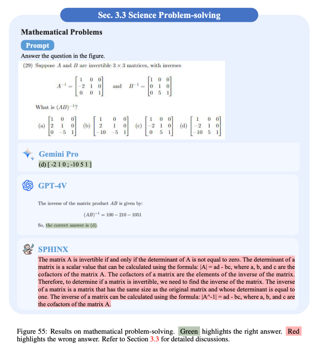 如果仅以图像作为输入,尽管 Gemini Pro 尝试在输出矩阵内提供答案,但无法正确识别空白位置,而 GPT-4V 和 SPHNIX 则无法进行第一步 光学字符识别。此外,给定相应的文本输入,Gemini Pro 和 GPT-4V 都可以给出正确的答案。