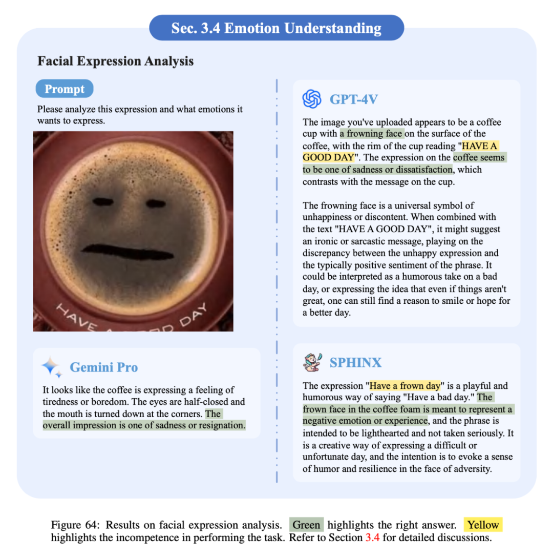 模型在表情分析中都表现出良好的性能。其中,GPT-4V 提供了更加辩证的思维和严谨的分析,Gemini Pro 则可以直接以简洁的信息给出准确的答案。图 64 中,GPT-4V 和 SPHNIX 都捕获图像中截断的文本内容,并将这些信息合并到推理中,展现了他们的综合视觉理解能力。