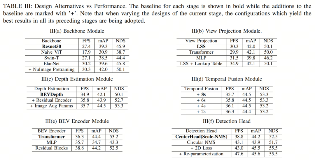 同时,深度估计模块,对于后投影深度优化的必要性,也被检查了。最初,它模仿了BEVDepth结构,如图6所示,其对复杂性的贡献为10.9%。因此,MLP层被替换为2层残差模块,这是一种最小主义的设计,将FPS提高了近一个点,将mAP提高了两个点(见表III(c))。此外,作者还通过集成图像增强矩阵进一步增强了它。尽管看似影响微小,但作者的实验结果证实了这种策略在增强模型性能方面的有效性。